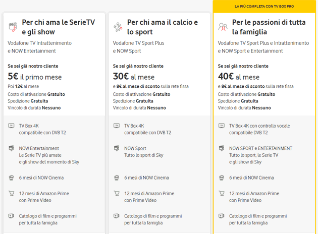 â— Vodafone TV Sport Plus e Intrattenimento e NOW Sport e Entertainment (40 euro/mese per già clienti Vodafone Fibra + 8 euro di sconto sulla rete fissa)