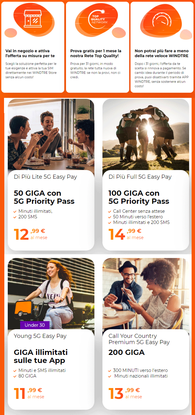 Tra le proposte comprese nel portafoglio WindTre, la nuova offerta ‘Di Più Full 5G’ mette a disposizione 100 Giga in 5G, minuti illimitati, 200 SMS, 50 minuti verso l’estero e Call Center senza attese a 14,99 euro al mese. ‘Di Più Lite 5G’, invece, prevede 50 Giga in 5G, minuti illimitati e 200 SMS a 12,99 euro al mese. Le due soluzioni, disponibili in modalità ‘Easy Pay’, rispecchiano le nuove esigenze di connettività e navigazione degli utenti. Per i clienti under 30 c’è ‘Young 5G’, che permette di utilizzare Giga illimitati per chat, musica, social, gaming ed e-learning, oltre a 80 Giga, minuti e SMS illimitati a 11,99 euro al mese. I clienti di altri Paesi che vivono in Italia, infine, possono provare l’offerta ‘Call Your Country Premium’, con 300 minuti per chiamare l’estero da utilizzare verso numeri sia fissi sia mobili e minuti nazionali senza limiti, a 13,99 euro al mese.