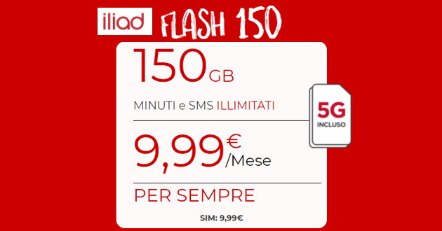 L’operatore Iliad ripropone, per un periodo limitato, l’offerta mobile "Flash 150", ora disponibile per tutti, nuovi e già utenti, fino al 14 aprile 2022. Al prezzo di 9,99 euro al mese, "Flash 150" include 150GB fino in 5G, Minuti illimitati, SMS illimitati, Minuti illimitati verso oltre 60 destinazioni, Minuti e SMS illimitati e 7GB dedicati in roaming in Europa.