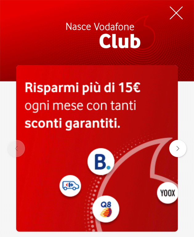 Vodafone ha lanciato Vodafone Club, nuova iniziativa per i suoi clienti mobile che, su abbonamento, offre accesso ad una serie di vantaggi offerti da Vodafone o da suoi partner per risparmiare su rifornimento, shopping e altro. E’ disponibile in due piani abbonamento: quello base da 3,99 euro e la versione plus, Vodafone Club+, che al prezzo di 14,99 euro ogni 6 mesi offre accesso ad ancora più agevolazioni.