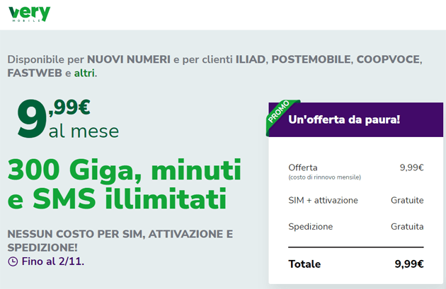 L’attivazione di questa offerta "300 Giga" è gratuita e possibile solo fino al 2 novembre 2022 per i clienti che passano a Very Mobile mantenendo il proprio numero da uno di questi operatori: 1 Mobile, BT Enìa, BT Italia, CMLink, CoopVoce, Daily Telecom Mobile, Digi Mobil, elimobile, Enegan, Fastweb, Feder Mobile, Green Telecomunicazioni, Iliad, Intermatica, Lycamobile, Mundio Mobile, Noitel, NTmobile, NV Mobile, Optima, Ovunque Mobile, Plink, Plintron, PosteMobile, Rabona, Telmekom, Tiscali, Vianova, WithU.