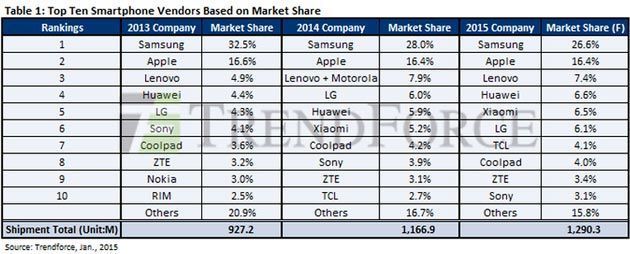 Lenovo e la sua Motorola (che ha acquistato nel 2014) è al terzo posto nel 2014 con una quota al 7,9 per cento nel mercato smartphone, seguita da LG al 6 per cento e dalla cinese Huawei al 5,9 per cento, secondo TrendForce.