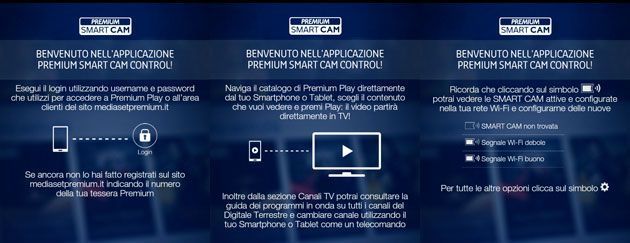 L’App Premium Smart Cam Control. Per poter controllare la cam è necessario scaricare sul proprio smartphone o tablet Android o iOS l’applicazione per Smartphone e Tablet "Premium Smart Cam Control" tramite la quale è possibile avviare la riproduzione sul tv di un contenuto di Premium Play, stopparlo o mandare avanti: lo smartphone diventa il ‘telecomandoì della Premium Cam Wifi, che visualizzerà i contenuti sul televisore. (si questo ci ricorda qualcosa… Chromecast, che Mediaset ha sudoratamente copiato). L’app consente anche di cambiare canale sul TV e visualizzare la guida TV dei principali canali. L’app è scaricabile dagli store AppStore di Apple e Play Store di Google. L’app Premium Smart Cam Control funziona con i dispositivi Android 4.0 o versioni successive, e sui dispositivi Apple con iOS 6.0 o versioni successive.