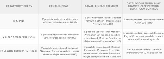 Per le TV con CI senza decoder HD (H264): è possibile vedere i canali in chiaro in SD ma non è possibile vedere i canali in chiaro HD (ad esempio RAI HD); è possibile vedere i canali Mediaset Premium in SD ma non è possibile vedere i canali Mediaset Premium in HD (ad esempio premium Calcio HD); NON è possibile vedere i contenuti Premium Play in SD o in HD tramite l’app Smart Cam Control.