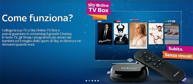Dove si può acquistare e quanto costa Sky Online TV Box? Sul sito ufficiale skyonline,it, su Amazon.it o presso altri rivenditori autorizzati (Euronics, LaFeltrinelli, Mondadori, Unieuro, MediaWorld), dal 21 maggio. Il prezzo è di 49,99 euro e si acquistano il box con incluso 1 mese di Cinema , SerieTV e show; il secondo mese di rinnovo di entrambi i ticket a 1 euro. Dal mese successivo, i prezzi del normale abbonamento (vedi sotto).