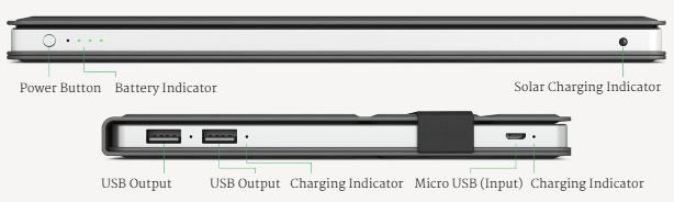 Nell’immagine seguente si possono vedere tutte le interfacce e i LED presenti sul margine laterale del dispositivo. Oltre al pulsante di alimentazione ci sono l’indicatore del livello della batteria, quello della ricarica solare, ci sono due output USB 2.1 (con relativi indicatori LED) e un micro USB per l’input (con relativo indicatore).