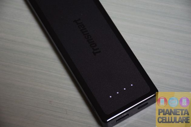 Sopra sono stati posizionati quattro LED bianchi abbastanza potenti anche per essere visti in esterno, i LED si attivano alla pressione del pulsante visto in precedenza o all’inizio della ricarica di un prodotto esterno tramite Powe Bank, ogni spia equivale al 25 percento di carica residua.