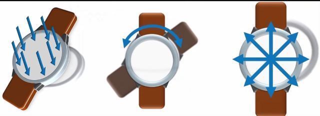 Le interazioni sono molteplici perchè sfruttando tutto il display circolare, permettono di creare 8 linee di direzione ognuna delle quali presenta 3 attivatori basati sulla pressione.