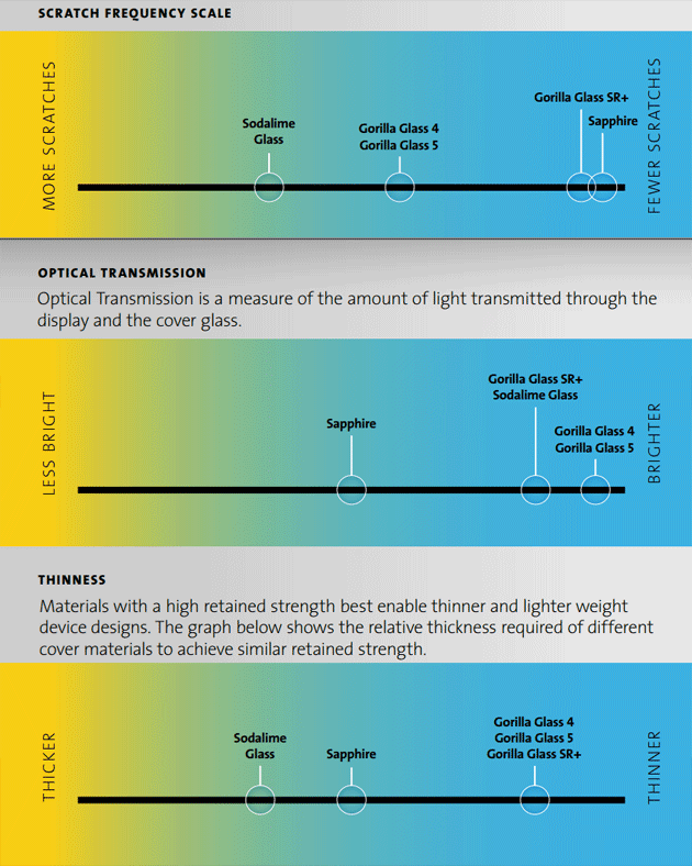 Presentato come una "innovazione rivoluzionaria" da Corning, il nuovo vetro Gorilla Glass SR+ offre una "resistenza ai graffi superiore che si avvicina a quella dei materiali di rivestimento alternativi di lusso" come si legge nel comunicato stampa, e anche se non menzionato viene fatto un probabile riferimento al zaffiro. "Corning Gorilla Glass SR+ offre una combinazione perfetta di proprietà che non è disponibile in qualsiasi altro materiale oggi disponibile – è in una classe a sé stante" ha dichiarato Scott Forester, il capo dei prodotti innovativi di Corning.