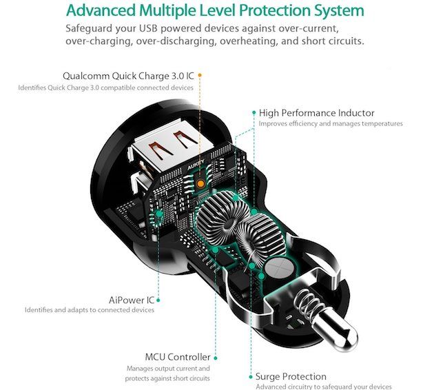 2) Caricatore da Auto Quick Charge 3.0: rimanendo negli accessori dedicati all’auto troviamo un comodissimo caricatore con presa che si collega direttamente all’accendisigari e che offre due porte USB per ricaricare automaticamente fino a due dispositivi (al seguente indirizzo la nostra recensione), da una parte fino a 5V 3Ah e dell’altra fino a 12V 1,5 Ah grazie alla ricarica rapida, in entrambi i casi sono presenti Chip specifici che regolano l’intensità della carica per salvaguardare la batteria.