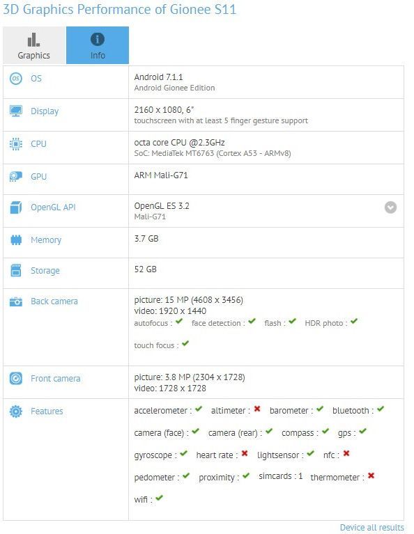 Prima della certificazione TENAA il Gionee S11 era apparso prima su GFXBench, dove i risultati di un benchmark hanno riportato la presenza di un display da 6 pollici di risoluzione 1080 x 2160 pixel, fotocamere da 16MP e 4MP, chipset quad-core MediaTek MT6763 con 4GB di RAM.