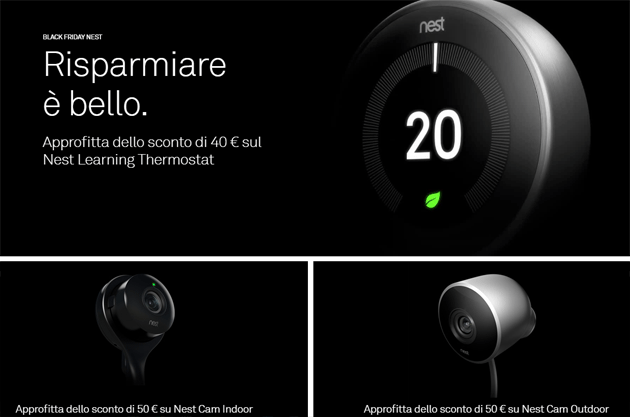 In occasione del Black Friday 2017, Nest propone sconti sul prezzo di acquisto di alcuni suoi prodotti tra cui delle telecamere Nest Cam Outdoor e Nest Cam Indoor e del Nest Learning Thermostat.