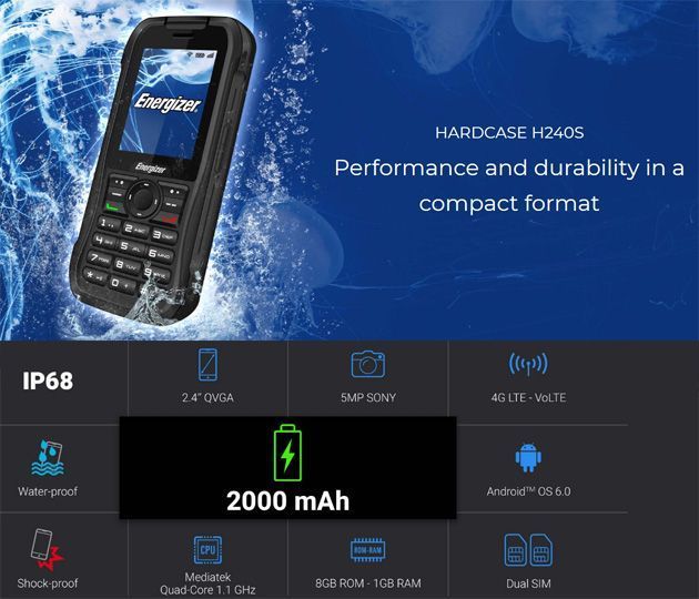 L’Energizer Hardcase H240S è uno smartphone alimentato da una batteria da 2000mAh ospitata dietro uno schermo TFT di 2.4 pollici di diagonale di risoluzione QVGA (240×320 pixel) e offre una fotocamera posteriore da 5MP (di Sony). Il processore è il Quad-Core Mediatek MT6737M con clock a 1.1GHz, GPU Mali T720 e 1GB di RAM mentre lo storage ammonta a 8GB ed è espandibile con microSD fino a 32GB. Il telefono esegue il sistema operativo Android 6.0 Marshmallow. Altre specifiche dell’Hardcase H240S di Energizer comprendono supporto per reti 4G Dual Sim, Bluetooth 4.0, Wi-Fi 802.11A b/g/n.