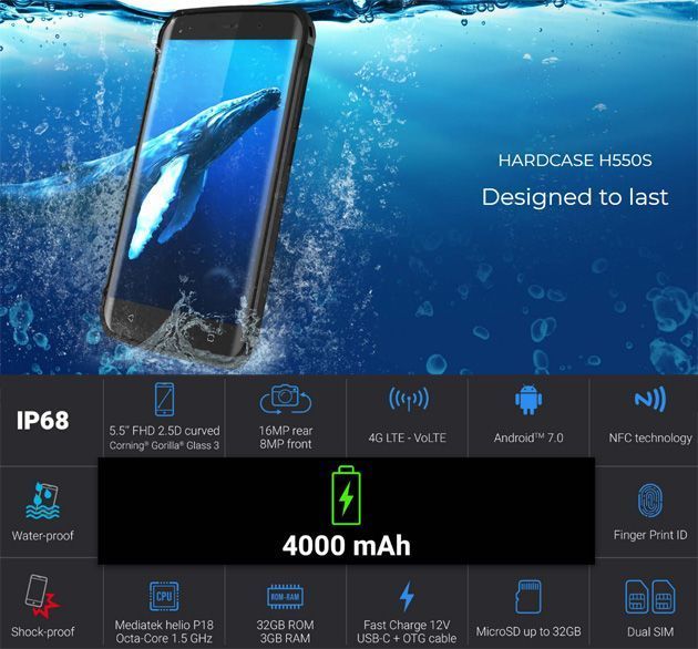 L’Energizer Hardcase H550S è uno smartphone alimentato da una batteria da 4000mAh ospitata dietro uno schermo LTPS di 5.5 pollici di diagonale di risoluzione fullHD (1080×1920 pixel) con ratio 16:9 e offre un comparto fotografico con una fotocamera posteriore da 16MP e una fotocamera frontale da 8MP. Il processore è l’Octa-Core Mediatek Helio P18 con clock a 1.5GHz con 3GB di RAM mentre lo storage ammonta a 32GB ed è espandibile con microSD fino a 32GB. Il telefono supporta la ricarica rapida fast charge e il sistema operativo è Android 7.0 Nougat fuori dalla scatola. Altre specifiche dell’Hardcase H550S di Energizer comprendono il lettore di impronte digitali, supporto per reti 4G Dual Sim e Bluetooth 4.0 LE.