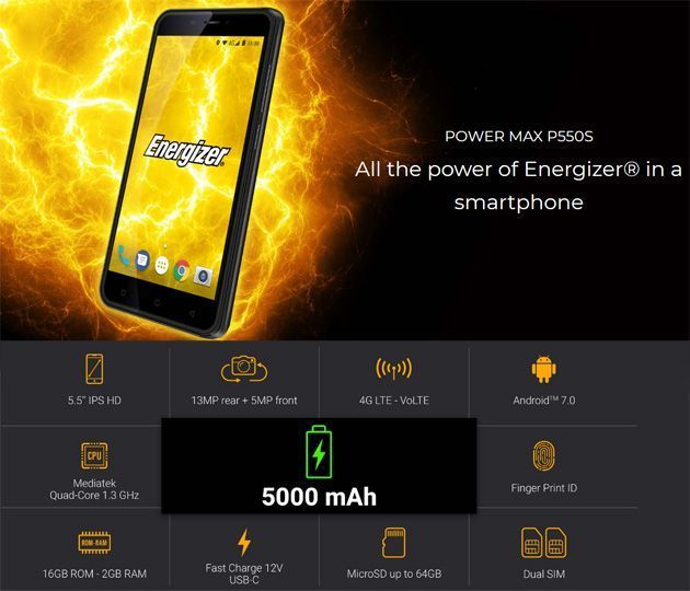 L’Energizer Power Max P550S è uno smartphone alimentato da una batteria da 5000mAh ospitata dietro uno schermo IPS di 5.5 pollici di diagonale di risoluzione HD (720×1280 pixel) con ratio 16:9 e offre un comparto fotografico con una fotocamera posteriore da 13MP e una fotocamera frontale da 5MP. Il processore è un Quad-Core Mediatek con clock a 1.3GHz con 2GB di RAM mentre lo storage ammonta a 16GB ed è espandibile con microSD fino a 64GB. Il telefono supporta la ricarica rapida fast charge 12V tramite connettore USB di tipo C e il sistema operativo è Android 7.0 Nougat fuori dalla scatola. Altre specifiche del Power Max P550S di Energizer comprendono il lettore di impronte digitali, supporto per reti 4G Dual Sim e Bluetooth 4.0 LE.