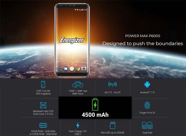 L’Energizer Power Max P600S è uno smartphone alimentato da una batteria da 4500mAh ospitata dietro uno schermo di 5.99 pollici di diagonale di risoluzione fullHD+ (1080×2160 pixel) con ratio 18:9 e offre un comparto fotografico con doppia fotocamera posteriore (13MP+5MP) e con una fotocamera frontale da 8MP. Il processore è l’Octa-Core Mediatek Helio P25 con clock a 2.5GHz. Due le versioni in base alle opzioni di memoria: 3GB di RAM e 32GB di ROM o 6GB di RAM e 64GB di storage in entrambi i casi con slot per microSD fino a 256GB. Il telefono supporta la ricarica rapida fast charge 12V tramite connettore USB di tipo C e il sistema operativo è Android 7.0 Nougat fuori dalla scatola. Altre specifiche del Power Max P600S di Energizer comprendono il lettore di impronte digitali, supporto per reti 4G Dual Sim e Bluetooth 4.1.