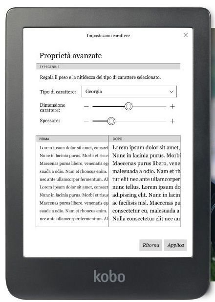 Kobo Clara HD è l’eReader Kobo piu’ piccolo disponibile, ha un corpo che misura 157x111x8.3mm e pesa 166grammi. La memoria interna è di 8GB per contenere fino a 6.000 eBook e Kobo Clara HD volta pagina 100ms più velocemente rispetto ai modelli precedenti. E’ possibile personalizzare la lettura grazie a TypeGenius che offre opzioni per cambiare il carattere tra 11 stili diversi, il peso, la nitidezza e le dimensioni tra le 50 disponibili; si possono regolare i margini, evidenziare passaggi, scrivere note e cercare il significato delle parole grazie al dizionario integrato. Il produttore promette una chiarezza importante delle parole visualizzate sulla schermata E-Ink del Kobo Clara HD con una lettura comoda anche alla luce diretta del sole grazie al display anti-riflesso.