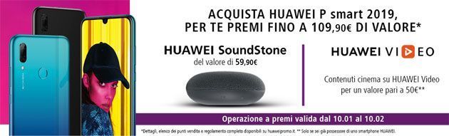 Chi acquista un Huawei P Smart 2019 tra il 10 gennaio 2019 e il 10 febbraio 2019 puo’ richiedere i premi sul sito web huaweipromo.it fino al 28 febbraio 2019.