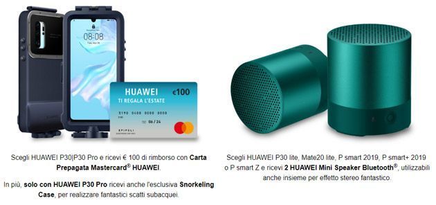 Huawei ha attivato una serie di promozioni che valgono per tutta l’Estate 2019, valide dal 27 giugno al 25 agosto, che consentono di ricevere 100 euro di rimborso, una Huawei Snorkeling Case oppure due Huawei Mini Speaker acquistando uno tra gli smartphone promozionati, che sono: P30, P30 Pro, P30 lite, Mate 20 lite, P Smart 2019, P Smart+ 2019 e P Smart Z.