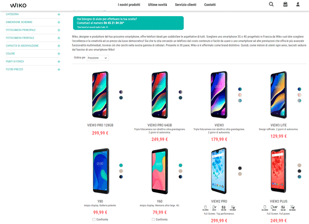 Navigare l’e-store di Wiko per acquistare qualcosa è semplice. Entrati nel sito è disponibile un menu orizzontale nella parte alta attraverso cui ci si puo’ dirigere verso una sezione specifica tra ‘I Nostri prodotti’, ‘Ultime Novita”, ‘Servizio Clienti’ e ‘Contatti’. Per navigare il catalogo dei prodotti acquistabili bisogna selezionare la prima voce, quindi si puo’ scegliere tra ‘smartphone’, ‘accessori’ e ‘oggetti connessi’. A questo punto si apre la pagina con la tipologia di prodotti selezionata, e si puo’ iniziare a filtrare il catalogo per opzioni quali ‘dimensione schermo’, ‘fotocamera principale’, ‘fotocamera frontale’, capacità di archiviazione’, ‘colore’, ‘punti di forza’. E’ possibile anche filtrare per ‘prezzo’ cosi’ da escludere a priori i prodotti che sono fuori dal proprio budget di spesa.