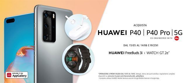 Chi acquista dal 15 maggio al 14 giugno 2020 presso tutti i rivenditori aderenti all’iniziativa Huawei P40/P40 Pro possono ricevere in regalo un paio di auricolari completamente wireless Freebuds 3i, del valore commerciale di 99,9 euro, e lo smartwatch Huawei Watch GT2e, del valore commerciale di 169,90 euro. Huawei P40 viene proposto in Italia al prezzo consigliato di 799.90 euro, mentre Huawei P40 Pro al prezzo di 1049.90 euro. In regalo, quindi, prodotti per un valore commerciale di 269,80 euro.