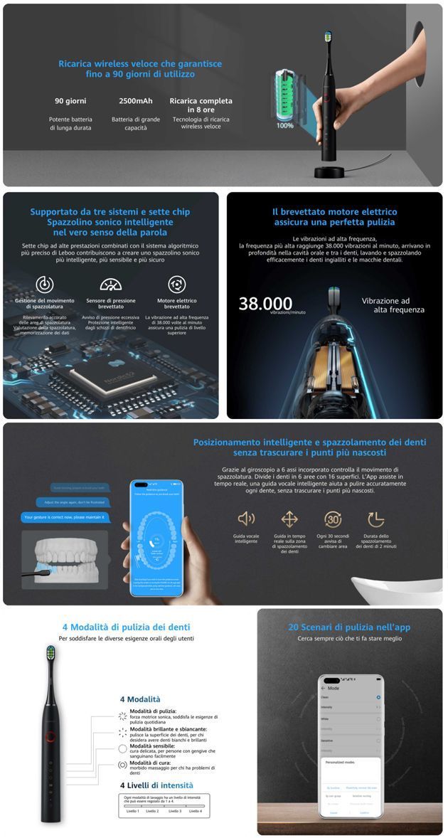 Supportato da HiLink, lo spazzolino Lebooo Smart Sonic associato all’app Huawei AI Life consente di eseguire diverse funzioni di monitoraggio della pulizia orale in tempo reale, rilevando l’efficacia della spazzolatura, attraverso la guida vocale di un coach personale. Si trova anche un sensore di pressione intelligente che aiuta a evitare danni allo smalto e alle gengive. Lo spazzolino in base alla pulizia che viene effettuata assegna anche un punteggio smart, per rendere in un certo senso più divertente la propria igiene orale. Trentasei sono le modalità di pulizia disponibili con questo spazzolino, con le modalità di pulizia, sbiancamento, sensibilità o la funzione di assistenza che offrono anche diversi livelli di pulizia, dal primo più “soft” fino al quarto più intenso, facilmente selezionabili tramite l’app. Lo spazzolino ha una autonomia di circa novanta giorni con una singola carica, e supporta la tecnologia di ricarica rapida wireless per la carica completa raggiungibile in circa otto ore.
