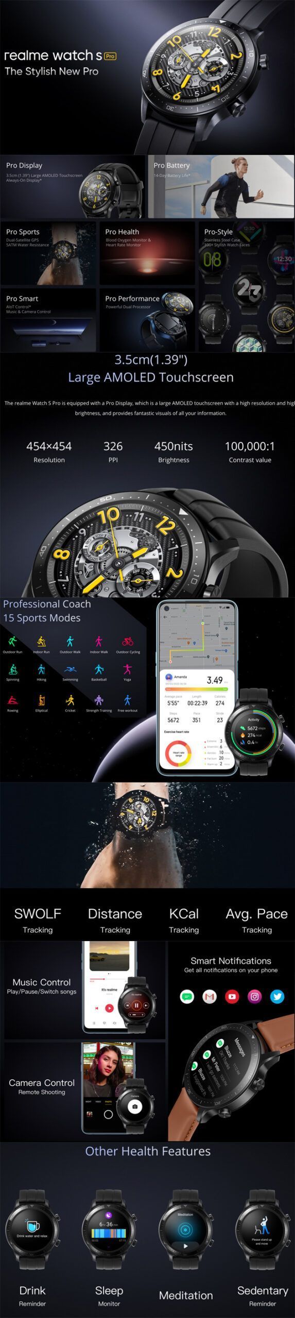 Realme Watch S Pro si presenta con un display Amoled a colori di diagonale 1.39 pollici di risoluzione 454×454 pixel (326ppi, 450nits, rapporto di contrasto 100.000:1) e quadrante personalizzabile con informazioni sempre visibili grazie alla funzionalità Always-On-Display. Sul lato destro del quadrante presenti due pulsanti fisici. I cinturini sono intercambiabili. L’orologio può monitorare il livello di saturazione dell’ossigeno nel sangue (SpO2), la frequenza cardiaca, il sonno e può tracciare fino a 15 modalità sportive (tra cui Corsa indoor/outdoor, Camminata indoor/outdoor, Bicicletta all’aperto, Spinning, Basket, Yoga, Rowing, Ellittica ed Esercizi a corpo libero) e visualizza in tempo reale i dati sullo schermo. L’orologio, resistente all’acqua fino a 5ATM, ha una autonomia stimata a fino 14 giorni. E poi durante la giornata conta i passi, le calorie, la distanza, e offre promemoria per l’assunzione di acqua e quando rileva sedentarietà e anomalie nella frequenza cardiaca. Realme Watch S Pro visualizza sul display, inoltre, le notifiche dallo smartphone collegato, e permette di gestire la musica in riproduzione e l’app fotocamera sul telefono collegato. Realme Watch S Pro integra anche un modulo GPS per tracciare meglio l’attività sportiva outdoor.