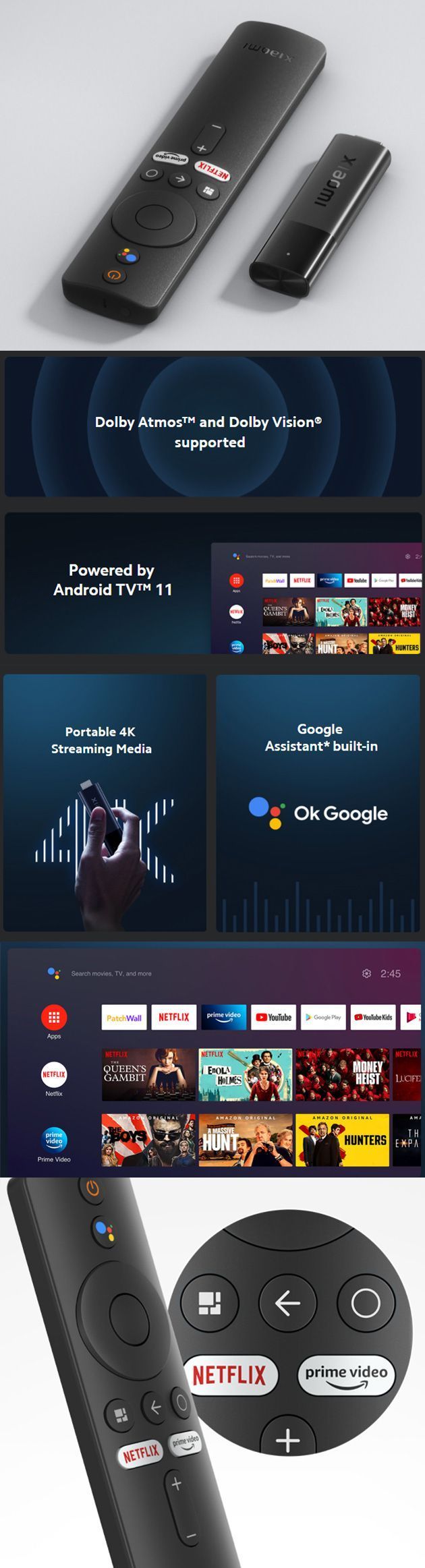 Il processore della Xiaomi TV Stick 4k è un quad-core Cortex-A35 con 2GB di RAM (il doppio rispetto alla Mi TV Stick) e GPU Mali-G31 MP2 mentre la memoria interna ammonta a 8GB di ROM (sufficienti per una chiavetta dedicata principalmente allo streaming). Il telecomando è praticamente lo stesso del modello precedessore, con i tasti per accensione/spegnimento, per attivare Google Assistant, direzionali, Home, per accedere alle impostazioni, per tornare indietro e il bilanciere del volume. Ci sono anche tasti per avviare rapidamente le app Netflix e Prime Video. Xiaomi TV Stick 4k supporta l’audio DTS HD e Dolby Atmos mentre la risoluzione video arriva a 4k, con supporto per HDR Dolby Vision e codec video VP9, H.265, H.264, MPEG-2, MPEG-1 oltre il più recente AV1. Niente Ethernet, la connettività ad internet è solo WiFi (dual-band 2.4GHz/5GHz). La connettività bluetooth è presente nella versione 5.0. Naturalmente, la disponibilità di Dolby Vision e Atmos dipende anche dalle capacità del dispositivo a cui la chiavetta è collegata.