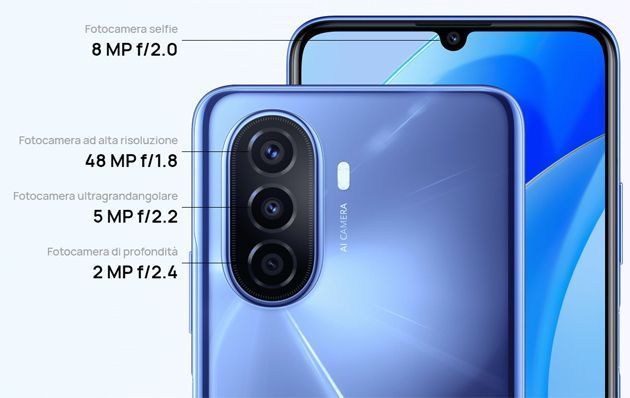 Il comparto fotografico del Nova Y70 propone una tripla-camera posteriore con obiettivo principale da 48MP con apertura focale da F1.8, un ultra-grandangolare da 5MP con apertura 2.2 e angolo di visione di 120 gradi e un sensore da 2MP per la profondità con apertura F2.4; nella parte frontale, all’interno di una notch, si trova una fotocamera da 8MP (F2.0) che supporta l’HDR, l’effetto bokeh (sfondo sfocato con soggetto in primo piano a fuoco) e l’algoritmo AI Beauty che consente di creare un filtro su misura basato sulle proprie caratteristiche come età e genere.