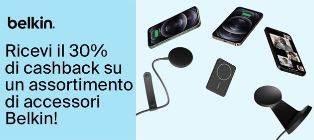 Il brand di accessori di elettronica di consumo Belkin ha attivato una promozione di cashback su una selezione di suoi prodotti, valida dal 15 ottobre 2022 e fino al 31 dicembre 2022. In questo periodo di tempo, è possibile usufruire un rimborso del 30% sull’acquisto di uno o più dispositivi del brand, tra caricatori da parete e auto, accessori magnetici compatibili MagSafe, auricolari True Wireless e con cavo, hub USB-C, powerbank e altro ancora.