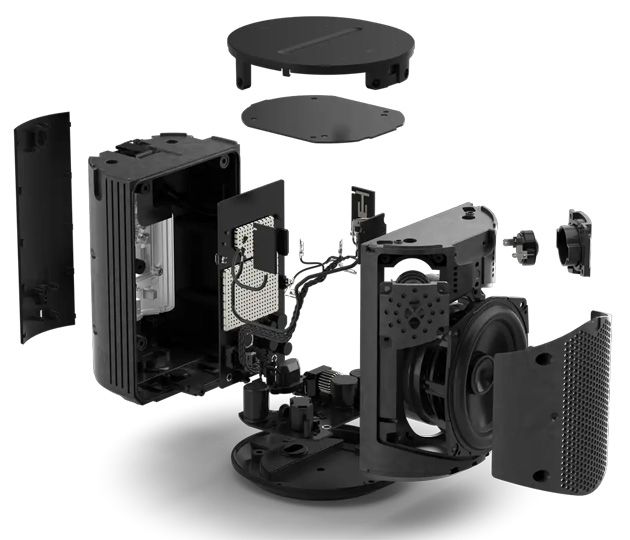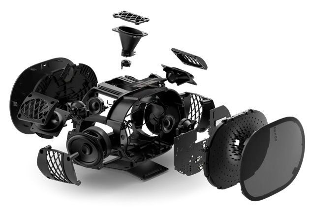 Lo speaker Sonos Era 300 misura 160mm in altezza, 260mm in larghezza e 185mm in profondità per un peso complessivo di circa 4,47kg. All’interno dello speaker si trovano quattro tweeter per la riproduzione delle frequenze media e altre, e due woofer orientati a destra e a sinistra per l’uscita delle basse frequenze. Il cuore dello speaker è un processore quad-core A55 con clock a 1.9GHz supportato da 8GB di memoria DDR4 e da 8GB di NAND.