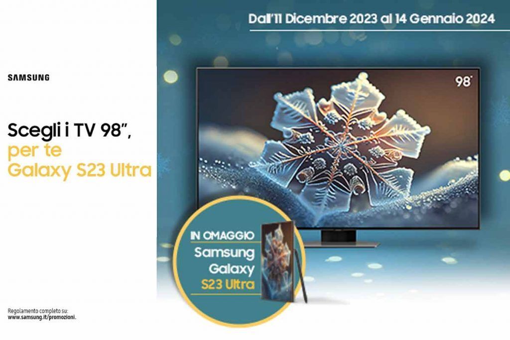 Samsung ha attivato in Italia la nuova operazione a premio denominata ‘Scegli i TV 98”, per te Galaxy S23 Ultra‘ attraverso la quale consente di ricevere in regalo uno smartphone Samsung Galaxy S23 Ultra una volta acquistato un televisore tra i modelli promozionati. L’iniziativa è valida dall’11 dicembre 2023 al 14 gennaio 2024 inclusi e riservata a chi acquista un nuovo televisore Samsung da 98 pollici tra i due modelli promozionati QE98Q80CATXZT e QE98QN90AATXZT.