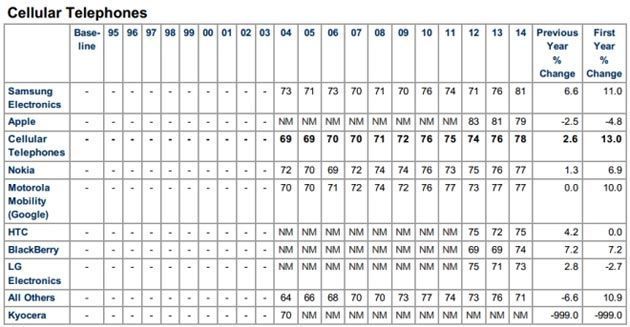 Anche altre società hanno avuto un anno decente pure, con Nokia, HTC, BlackBerry, LG che sono riuscite a migliorare i loro punteggi di soddisfazione del cliente rispetto allo scorso anno, mentre Motorola ha mantenuto la stessa cifra.