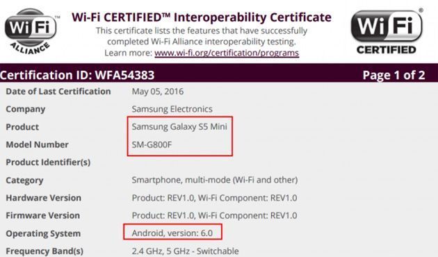 Ulteriore conferma che Il Samsung Galaxy S5 mini è dunque in procinto di ricevere un aggiornamento alla versione più recente di Android, la 6.x Marshmallow, ma lo si sapeva dallo scorso maggio, quando nel sito della Wi-Fi Alliance, dove vengono elencati i dispositivi certificati WiFi, era comparsa una scheda relativa ad un Galaxy S5 Mini di Samsung con Android 6.0 Marshmallow in esecuzione.