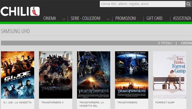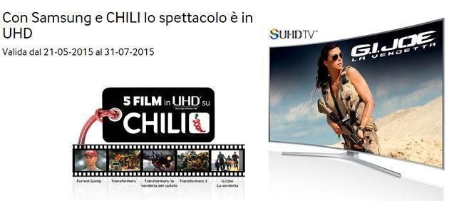 Dal 21 maggio e fino al 31 luglio 2015 acquistando nei negozi che aderiscono all’iniziativa un TV Samsung SUHD o UHD serie JU e JS si riceveranno, inclusi nel prezzo, cinque film in UHD da vedere su CHILI.