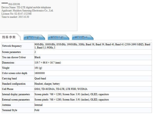 Il dispositivo col numero di modello SM-G9198, le cui specifiche sono trapelate attraverso GFXBench nel mese di Giugno, è stato approvato questa settimana dall’organo di certificazione cinese TENAA. Si è speculato sul fatto che SM-G9198 potrebbe essere il Galaxy S6 mini, ma in realtà non sarà così: in realtà sembra essere un dispositivo clamshell destinato al mercato cinese. Le foto allegate alla documentazione TENAA – e pubblicate su Sammobile – mostrano infatti un dispositivo a conchiglia. Potrebbe essere il successore del SM-G9098, che è stato rilasciato in Cina lo scorso anno.