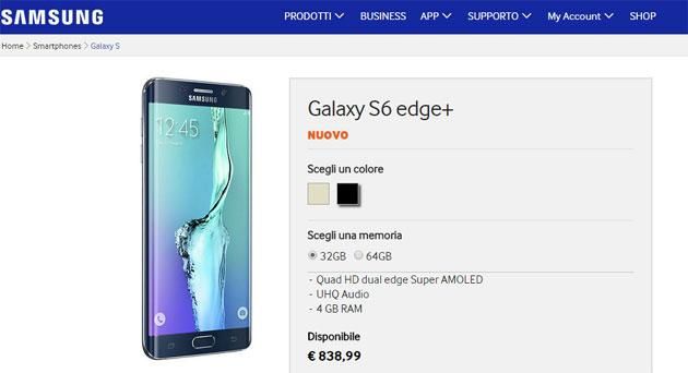 Samsung Galaxy S6 edge+ è disponibile in Italia nei colori Black Sapphire, Gold Platinum e Titanium Silver al prezzo consigliato al pubblico di 839 euro nella versione da 32GB e di 939 euro in quella da 64GB.