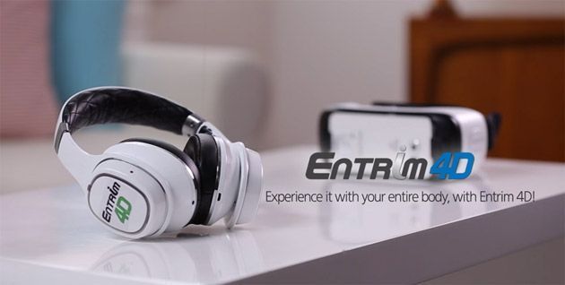 Entrim 4D è un accessorio per il visore Gear VR, nella pratica sono un paio di cuffie, che utilizza una combinazione di algoritmi per rendere ancora piu’ immersiva l’esperienza di realtà virtuale che vive l’utente facendo sincronizzare i movimenti del corpo con quello che si vede nel video – ad esempio, se siete sulle montagne russe o a bordo di un’auto da corsa, il suono emesso dalla cuffia vi farà credere di vivere realmente quella esperienza, e di conseguenza il vostro corpo si muoverà come se foste sulle montagne russe o a bordo di un’auto sportiva.