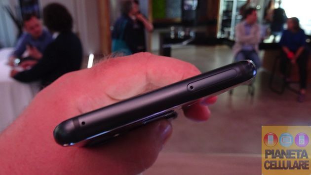 Sopra il secondo microfono per la riduzione dei rumori di sottofondo ed il carrellino che può contenere una Sim in formato Nano ed una Micro SD per espandere i 64 GB interni fino ad un massimo di 256 GB.