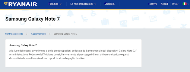 Quella che vedete appena sopra è una nota ufficiale apparsa nel sito Italiano della compagnia aerea, come possiamo notare viene consigliato ai passeggeri di spegnere Note 7, non riaccenderlo in aereo nonostante sia previsto l’utilizzo in modalità aereo normalmente, non mettere il prodotto nel bagaglio da imbarcare in stiva e soprattutto di non ricaricarlo dato che la maggior parte dei casi di esplosione si sono verificati proprio in questa situazione.