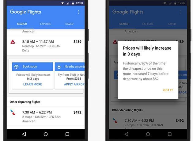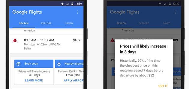 Infatti, Google è anche in grado di consigliare l’acquisto immediato se prevede che un volo è probabile che venga a costare di più dopo qualche ora o giorno, e si potrebbero per esempio risparmiare 50 euro se si prenota prima di allora.
