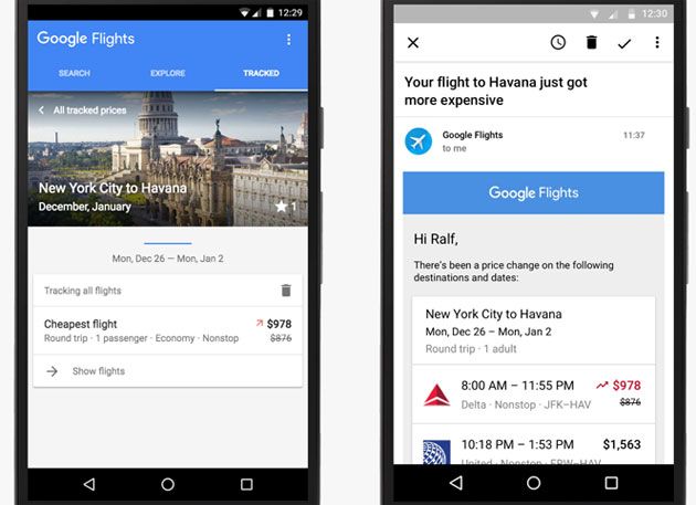 Nel momento in cui i prezzi aumentano o calano in modo significativo, le persone vengono avvisate via e-mail e tramite scheda Google Now. L’utente potrà anche continuare a ricevere gli aggiornamenti quando i prezzi effettivamente aumentano o diminuiscono in modo significativo per i voli monitorati.