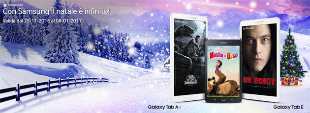 L’operazione a premio denominata "Samsung ti regala un Natale Infinito" è valida per l’acquisto di uno dei modelli di Galaxy Tab A6 7”, Galaxy Tab A6 10.1”, Tab E presso i punti vendita aderenti che espongono il materiale pubblicitario e presso gli e-store indicati nel regolamento. Per chiedere il premio è necessaria la registrazione all’operazione su www.samsungpeople.it/nataleinfinito entro il 3 febbraio 2017. Seguendo le istruzioni, riceverai un codice voucher da inserire sul sito http://www.infinitytv.it/ entro il 3 marzo 2017 per usufruire di 12 mesi dei film e serie TV disponibili su Infinity.