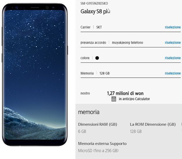 Samsung Galaxy S8+ 6GB sullo shop online di Samsung Corea