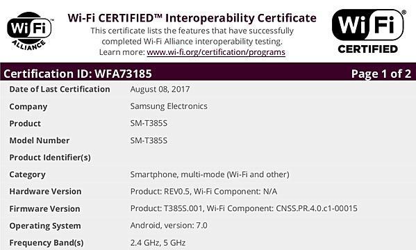 Stando a quanto rivelato dalla certificazione WiFi, il Samsung SM-T385S esegue il sistema operativo Android 7.0 Nougat fuori dalla scatola e supporta la connettività WiFi dual-band, sia a 2.4GHz che a 5GHz.