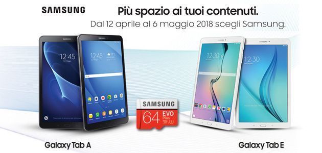 Samsung ha attivato l’operazione a premi denominata "Piu’ Spazio ai tuoi contenuti" attraverso la quale regala una scheda di memoria MicroSD da 64GB EVO Plus a chi acquista tra il 12 aprile e il 6 maggio 2018 un tablet Galaxy Tab A o Tab E. Scopriamo come partecipare all’operazione a premi per avere in regalo la Micro SD direttamente a casa.