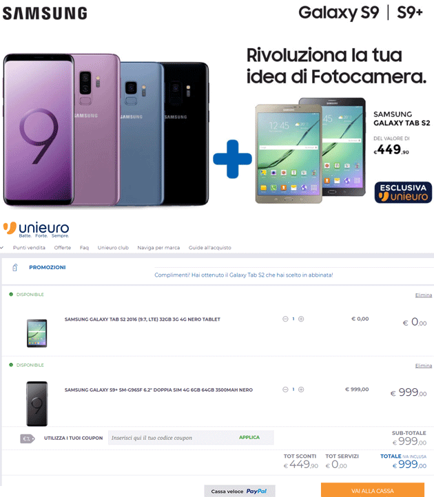 Ricevere il regalo da unieuro.it è facile: bisogna inserire nel carrello uno degli smartphone in promozione (tutti i Galaxy S9 e Galaxy S9+ con Garanzia Italia disponibili nel ctalogo) per vedere nella pagina del carrello l’invito ad aggiungere un Galaxy Tab S2 (se non è già stato inserito in precedenza); quando entrambi i prodotti sono nel carrello, ossia lo smartphone e il tablet Galaxy Tab S2, quest’ultimo viene scontato del 100% (quindi si paga solo lo smartphone). Il valore commerciale del tablet è di 449 euro.