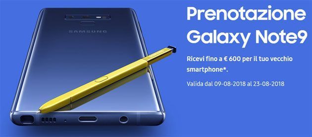 Il Galaxy Note9 è diventato ufficiale il 9 agosto e negli Stati Uniti già da una settimana prima Samsung aveva aperto le prenotazioni promettendo un risparmio di fino a 450 dollari a chi decide di consegnare il vecchio smartphone in cambio del nuovo modello. Samsung Italia ha aperto la fase di prenotazioni subito dopo l’annuncio del nuovo phablet con una promozione simile: prenotando e acquistando il Galaxy Note9 tra il 9 e il 23 agosto 2018 è possibile ricevere una valutazione di fino a 600 euro sul vecchio smartphone da consegnare a Samsung. Il programma di scambio del vecchio smartphone accetta modelli di quattro produttori di smartphone – Samsung, Apple, Huawei e LG – e il risparmio arriva ‘fino a’ 600 euro con il valore che varia in funzione del modello che si va a restituire (ad esempio, passare da iPhone X o Galaxy Note8 a Galaxy Note9 garantisce un risparmio fino a 600 euro mentre passare da iPhone 8 o Galaxy S8 garantisce un risparmio di fino 400 euro).