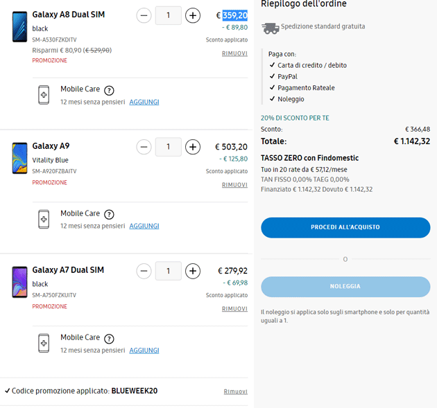 Carrello esempio su Samsung Shop Online con promozione ‘Blu Week’