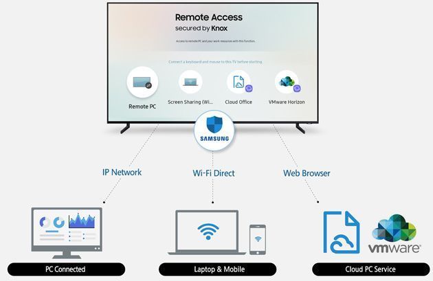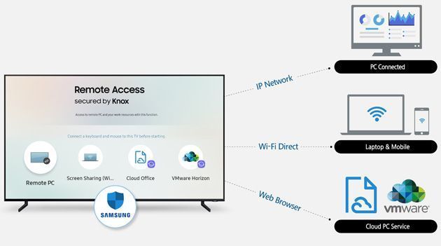 Con l’accesso remoto, i dispositivi di input, incluse le tastiere, possono essere collegati ad una Smart TV Samsung, rendendo più facile il ​​controllo dei contenuti sullo schermo. Senza una connessione cavo HDMI separata gli utenti possono accedere da remoto ad un PC nella loro cucina attraverso la TV nel loro soggiorno per svolgere varie attività, tra cui navigare sul Web o riprodurre sullo schermo della TV utilizzando una tastiera e un mouse collegati al televisore.